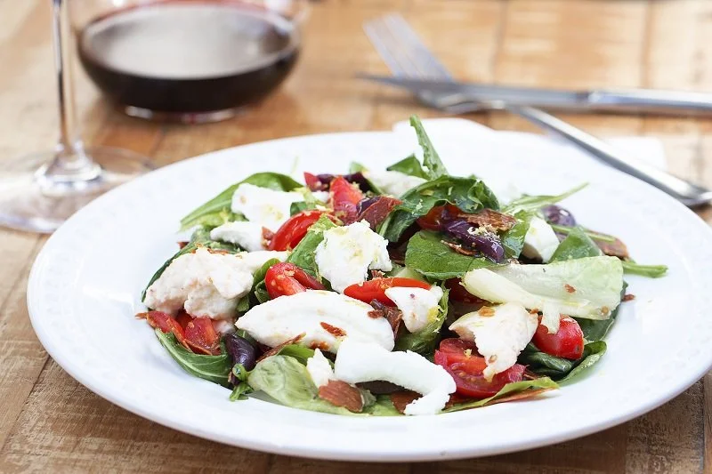 Rúcula, alface romana, manjericão, mozarela de búfala fresca, tomate cereja, chips de presunto cru italiano, raspas de limão siciliano e azeite de oliva.